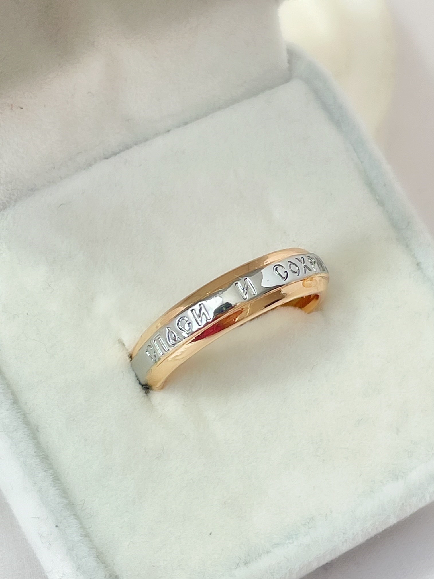 Красивое кольцо из дубайского золота с надписью "спаси и сохрани"