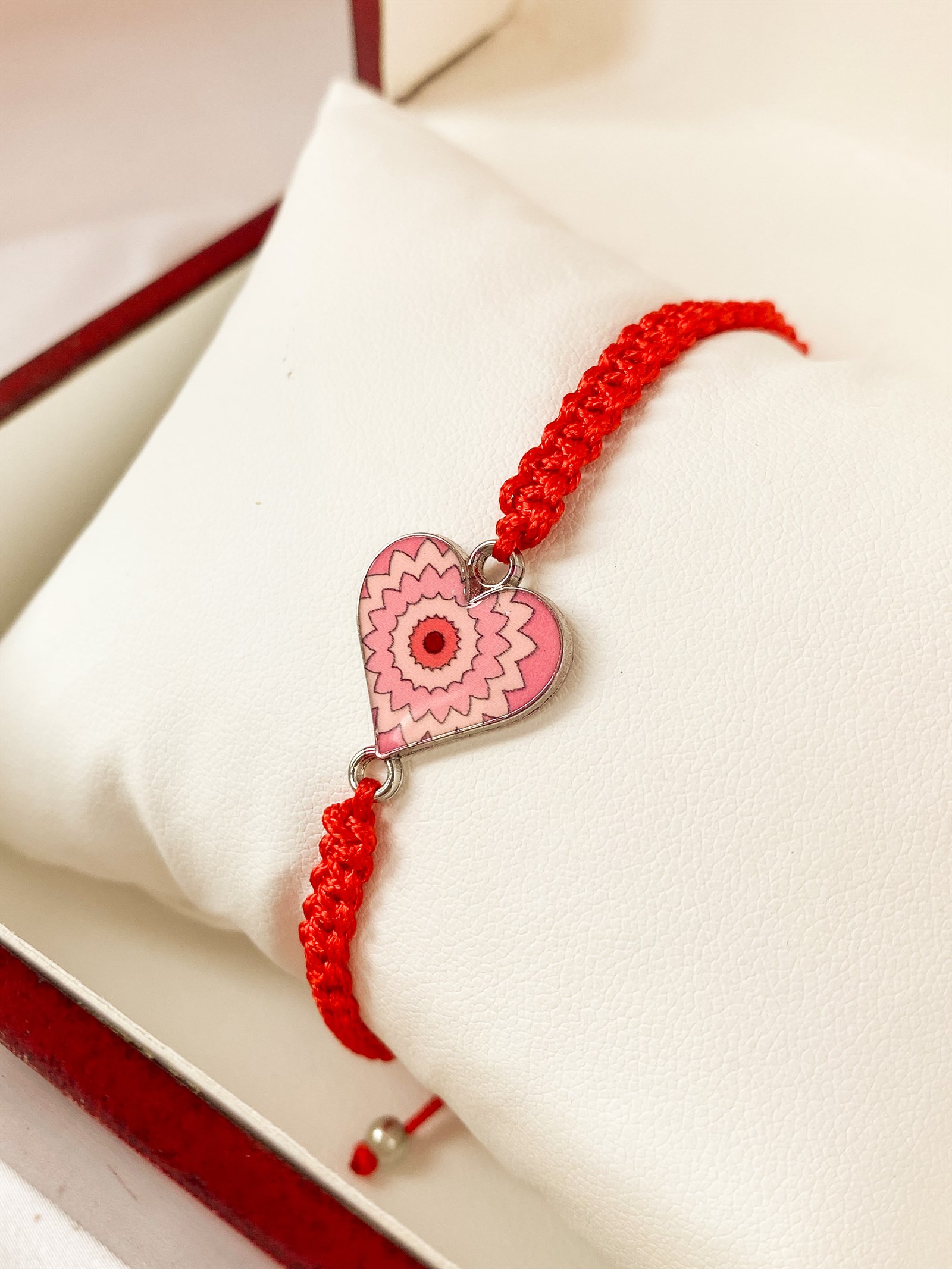 Яркая красная нить с подвеской в виде сердца. Для больших и маленьких модниц.